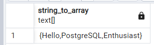 Explanation: Splits the string ‘Hello PostgreSQL Enthusiast’ into an array with each word separated by commas