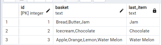 Example: Access Last Element of the Array, First convert the “basket” column from string to array using string_to_array() function and then get the last element by using array_length() function as shown below